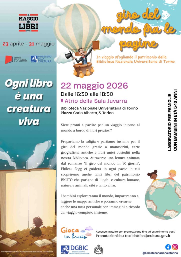 La Biblioteca Nazionale Universitaria di Torino aderisce alla sedicesima edizione de Il Maggio dei Libri, iniziativa nazionale di promozione della lettura organizzata dal Centro per il Libro e la Lettura e dal Ministero della Cultura, che dal 2011 promuove valore sociale dei libri quale elemento chiave della crescita personale, culturale e civile. Il nostro istituto si inserirà nel secondo dei filoni tematici proposti quest’anno, “Creature in cammino”, presentando il laboratorio per famiglie “Giro del mondo fra le pagine: in viaggio sfogliando il patrimonio della Biblioteca Nazionale Universitaria di Torino”.
